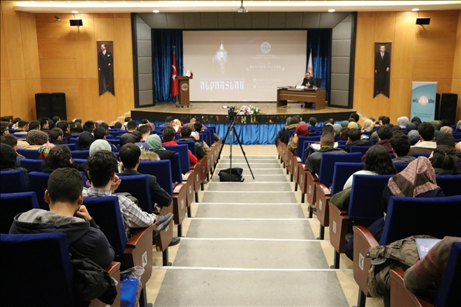 Alanoğlu´nun ardından ?´Doğu´nun ve Batı´nın Büyük Sultanı Alparslan´´ başlıklı sunumunu yapmak üzere kürsüye davet edilen Tarih Bölümü Başkanı Doç. Dr. Mustafa Alican, sözlerine tarih bilincinin önemi ve bu bilincin devlet, vatan ve kimlik oluşumu sürecindeki etkisiyle başladı. Milletlerin ve devletlerin tarihte geçirdiği bunalım ve kriz sürecinin en şiddetli olduğu anlarda, kurtarıcı olarak liderlerin ortaya çıktığını ifade eden Doç. Dr. Mustafa Alican, yakın zamanda yayımlanan ?Doğu´nun ve Batı´nın Büyük Sultanı Alparslan? isimli kitabından hareketle, Selçuklu Sultanı Alparslan´ın tarihsel şahsiyetine, karakterine ve İslam tarihindeki yönlendirici rolüne dikkat çekti. Doç. Dr. Alican, daha sonra Alparslan´ın ?İslam Sultanı? olarak yaşamından, faaliyetlerinden ve dindarlığından bahsedip birkaç örnek ile Sultan Alparslan´ın tarihteki önemine vurgu yaptı. Sultan Alparslan´ın tarihi bir kahraman olarak etki ettiği Malazgirt Zaferi´ne değinen Alican, konuşmasını bu zaferin Anadolu´nun İslamlaşma ve Türkleşmesindeki rolü ile dünya tarihindeki kısa ve uzun vadeli sonuçlarına değinerek bitirdi. Üniversitemizin çeşitli bölümlerinden akademisyen ve öğrencilerin yoğun katılım gösterdiği konferans, Alanoğlu tarafından Alican´a teşekkür belgesi takdim edilmesiyle sona erdi.