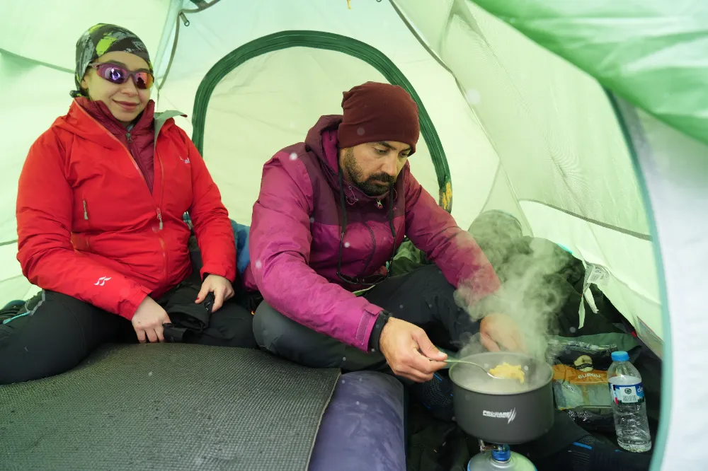 Eğitim programına Mardin’den katılan Uğur Çetinkaya, "Yaklaşık bir haftadır buradayız. İlk iki gün hava çok güzeldi, sadece biraz kuru soğuk vardı. Üçüncü günden sonra kar yağmaya başladı. Tabii, haliyle bazı çadırlarımız çöktü, karlar hava kanallarını tıkadı. Bu durum üzerine teorik eğitim programı değiştirildi ve hemen çadır kontrollerini sağladık. Dün gece yine kar yağmaya devam etti. Saat 04.00'te nöbetleşerek uyanık kaldık ve çadırlarımızı tahliye ettik. Eğitime ara verdik. Bu arada yemek için makarna yaptık; bizim ana yemeğimiz genellikle makarna oluyor. Hocalarımızla birlikte yemek hazırlıyoruz. Çadırda kalmak zorlayıcı olabilir, ancak bu da eğitimin bir parçası. Türkiye Dağcılık Federasyonunun bize sunduğu bu güzel faaliyetlerden, hocalarımızın bilgileri ve tecrübelerinden faydalanmak bizim için büyük bir fırsat. Gerekli önlemleri alarak şişme yatağın üstüne mat seriyoruz, çünkü bazen sıcaklık çok düşük olabiliyor. Uyku tulumunun içine ek bir tulum koyarak ekstra önlem alıyoruz ve çadırda kalmaya devam ediyoruz" şeklinde konuştu.