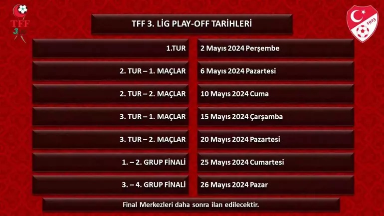 Futbolseverlerin büyük bir ilgiyle takip ettiği 3. ligde, Play-Off mücadeleleri kapsamında ilk tur maçları 2 Mayıs Perşembe günü başlayacak. Kazanan takımlar, yoluna devam ederek üst turlar için 6 Mayıs Pazartesi ve 10 Mayıs Cuma günleri sahaya çıkacak. Kıyasıya geçen bu turun ardından başarılı olan ekipler, 15 Mayıs Çarşamba günü ve 20 Mayıs Pazartesi günü oynanacak rövanş maçlarıyla finale adını yazdırmak için mücadele verecek. Tüm gözlerin çevrileceği final karşılaşmaları ise 1'inci ve 2'nci gruplar için 25 Mayıs Cumartesi, 3'üncü ve 4'üncü gruplar için ise 26 Mayıs Pazar günü gerçekleştirilecek.