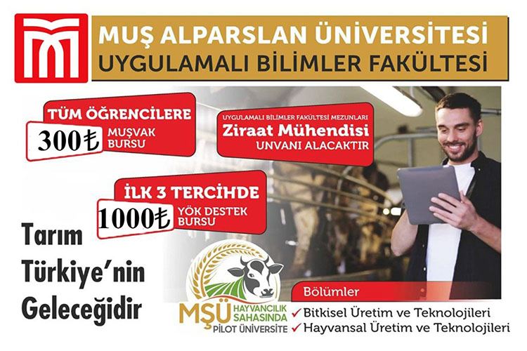 Muş Alparslan Üniversitesi Uygulamalı Bilimler Fakültesi Dekanı ve Rektör Yardımcısı Prof. Dr. Yaşar Karadağ, ziraat okumak isteyen öğrencileri fakültelerine davet ederek şunları dile getirdi: “Ülkemizin 165 bin hektar ile yekpare 3. Büyük ovasına sahip olan, doğunun incisi Sultan Alparslan Yurdu Muş'a, 24 Temmuz 2017 yılında kurulan Muş Alparslan Üniversitesi Uygulamalı Bilimler Fakültesi sırasıyla; Bitkisel Üretim ve Teknolojileri Bölümü, Hayvansal Üretim ve Teknolojileri Bölümü ile Bilişim Sistemleri ve Teknolojileri Bölümü olmak üzere 3 bölümden oluşmaktadır. Uygulamalı Bilimler Fakültesini tercih eden her bir öğrencimize Muş Vakfı (MUŞVAK) tarafından karşılıksız 300 TL burs imkanı sağlamakla birlikte Bitkisel Üretim ve Teknolojileri Bölümü ile Hayvansal Üretim ve Teknolojileri Bölümü’nü tercih eden ve ilk 3’e giren öğrencilerimize 1000 TL Yükseköğretim Kurulu (YÖK) tarafından karşılıksız burs imkanı da sağlanmaktadır. Uygulamalı Bilimler Fakültesi Bitkisel Üretim ve Teknolojileri ile Hayvansal Üretim ve Teknolojileri Bölümü mezunlarımıza Ziraat Mühendisi Ünvanı verilmektedir.” Dedi.