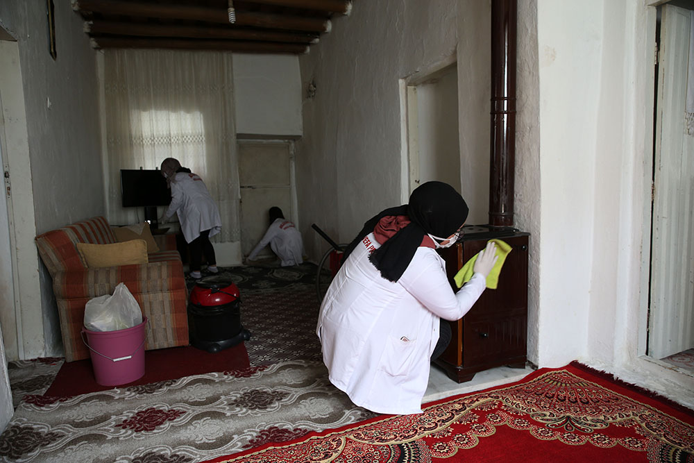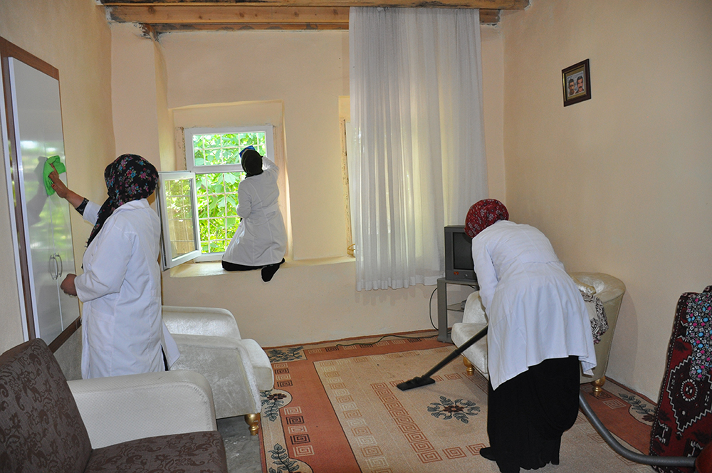 Kaymakamlığın desteğiyle ilçe merkezi ve köylerde belirlenen evlere giderek temizlik yapan, perdeleri yıkayan, halıları silen görevliler, bayrama kadar sisteme kayıtlı 126 evin temizliğini tamamlamak için çalışma yürütüyor.