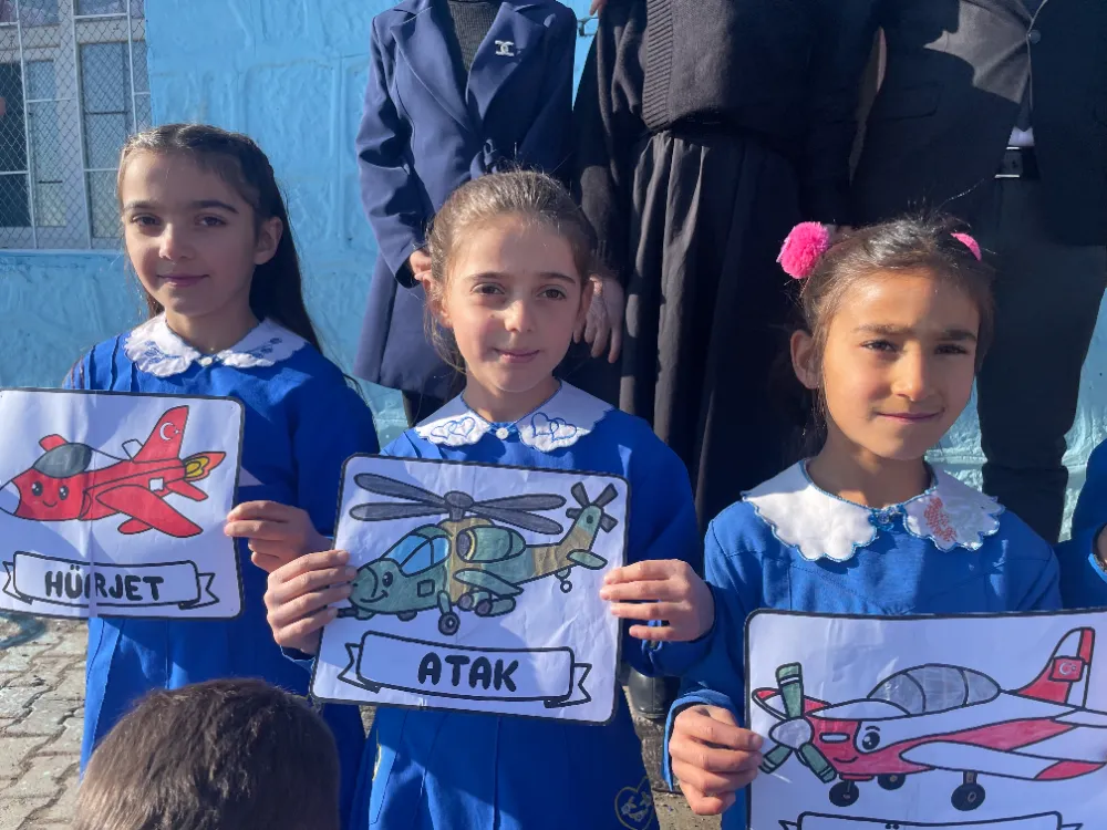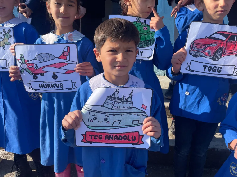 Okul Müdürü Mensur Demir ve öğretmenler, etkinliğin amacını şu sözlerle anlattı: "Bu çalışmayı Tutum, Yatırım ve Türk Malları Haftası kapsamında gerçekleştirdik. Amacımız çocuklarımıza ülkemizin kendi imkânlarıyla ürettiği teknolojileri tanıtmak ve erken yaşta farkındalık oluşturmaktı. Öğrencilerimiz savunma sanayimize ait araçları hayal güçleriyle çizdi, biz de bu çizimleri yapay zekâ desteğiyle canlandırdık. Çocuklarımızın heyecanı ve mutluluğu her şeye değerdi. Burada gördüğümüz şey sadece bir resim değil; minik ellerden çıkan büyük bir vatan sevgisidir. Yerli ve millî değerlerle yetişen bu çocuklar, gelecekte ülkemiz için daha iyisini yapma hayaliyle büyüyecek." (İHA)
